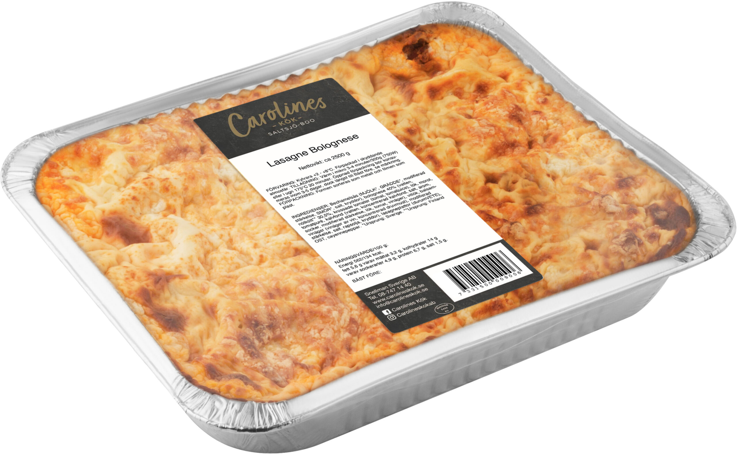 INGREDIENSER: Bechamelsås (MJÖLK*, GRÄDDE*, modifierad stärkelse, SMÖR*, salt, kryddor), bolognese 40% (vatten, nötkött** 30,5%, krossade tomater, lök, morot, tomatpuré, kalvfond (vatten, salt, arom, koncentrerad kalvfond, socker, modifierad stärkelse, lök, tomat, vinäger), vitlök, balsamvinäger, modifierad stärkelse, salt, rapsolja, kryddor), lasagneplattor 9,3% (durumVETE, vatten), OST, cayennepeppar. *Ursprung: Sverige **Ursprung: Finland